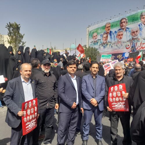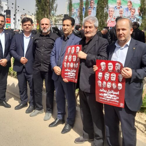 در این آیین حماسی که مردم پرچم ایران را در دست گرفته و در محکومیت جنایات اسرائیل و آمریکا و همچنین حمایت از نیروهای مسلح و مقام معظم رهبری شعار سر میدهند، چهرهها و مسئولین سیاسی و نظامی نیز حاضر شدهاند.